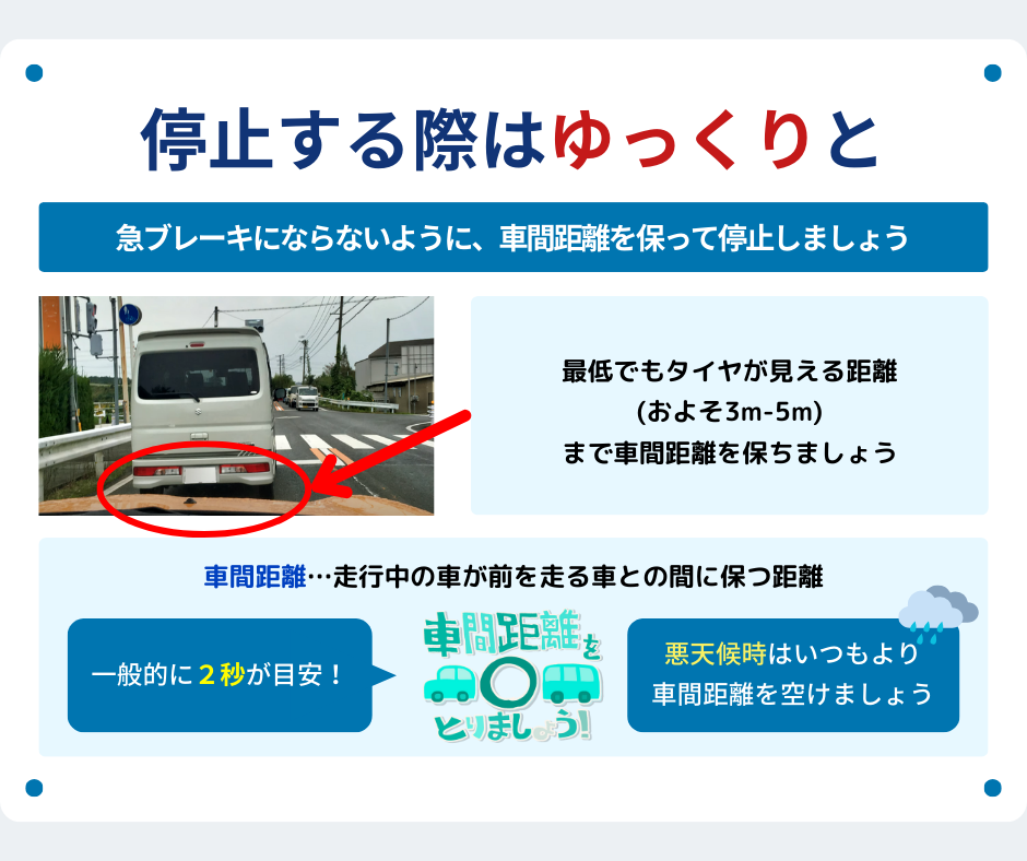 また、急ブレーキではなくゆっくりと停まるように意識しましょう。