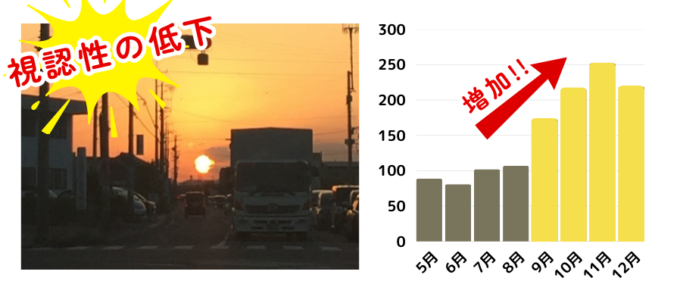 日が沈む時間が早くなる9月は、 夕方頃の交通事故死者数が増加します。