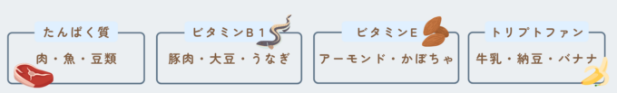 たんぱく質・ビタミンB1・ビタミンE・トリプトファンなどの栄養素が入った食べ物をバランスよく摂取しましょう。