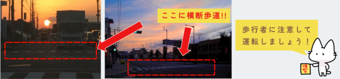 秋の夕暮れは、日の入りが早く、視認性が悪いことから自動車と歩行者の交通事故が多発する時期です。