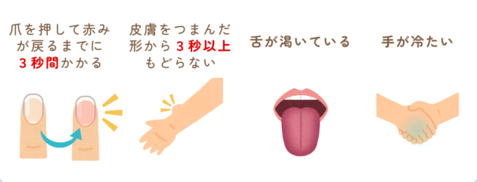 また、めまいや発熱、吐き気、集中力の低下なども脱水症状のサインです。