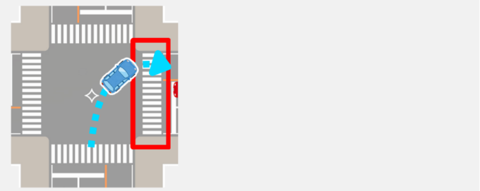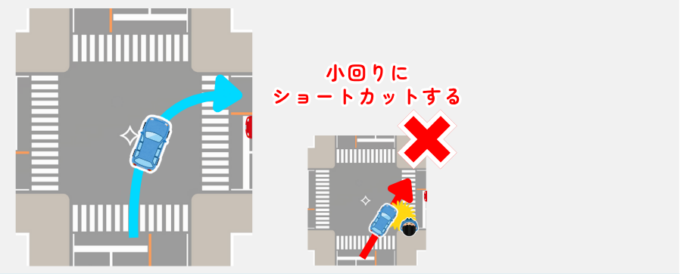 2.右折の安全確認ができ次第、少し大回り気味に右折する