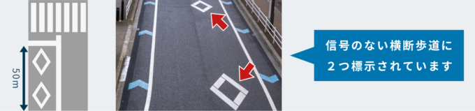 信号のない横断歩道の50m手前にひし形の道路標識が2つペイントされています。