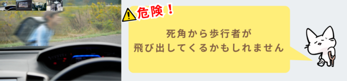 ピラーで死角になっている前後の端・車から近く、低いものは運転席から見えなくなります。
