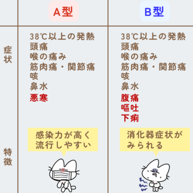 B型・・・38℃以上の発熱、頭痛、喉の痛み、筋肉痛、関節痛、咳、鼻水、腹痛、嘔吐、下痢など…